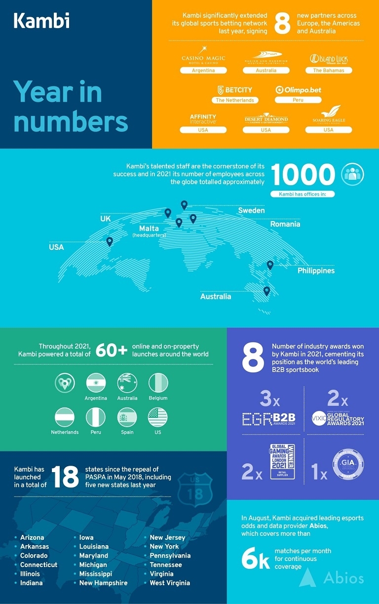 2021 was yet another extraordinary year for Kambi, with an ever-growing partner network and a new addition to the Kambi group following its acquisition of eSports data, content and odds provider Abios. Furthermore, the company hit some significant milestones, not least being the recipient of a coveted 10-year Mobile Sports Wagering Platform license in New York State, the fourth most populous state in the United States. Below, Kambi summarises some of these key achievements ahead of another important year.
