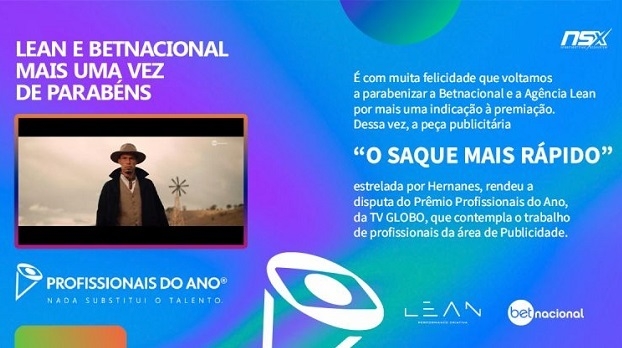 The NSX Group points out that "it is with great happiness that we congratulate Betnacional and Lean Agência for another nomination for the award. This time, the publicity piece "The fastest withdrawal", starring Hernanes, won the competition for the Professional of the Year Award, from TV Globo, which includes the work of professionals in the area of Advertising".
