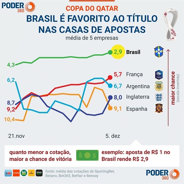 Poder360 compiles daily the most quoted selections to win the World Cup in 5 betting sites: SportingBet, Betano, Bet365, Betfair and Betway.