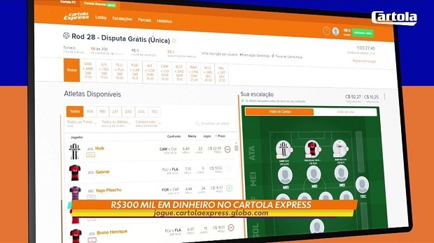 Cartola Express is a licensing of the original game, with a different dynamic, which allows users to assemble their teams and participate in competitions in various ways, which can change from round to round with disputes and various awards. The player can bet in full round, with all games, or for a single day (such as Wednesday or Sunday, for example). The player who opts for the Express will be able to assemble one or more teams. For now, the tactical scheme is 4-3-3, but the strategies continue to be based on knowledge about the players.
