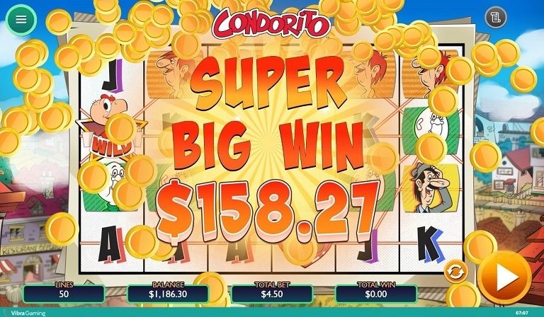 The main screen will have a series of special features that provide greater variety to the game experience while highlighting different situations of the story. Such is the case in one of the features where Condorito and Pepe Cortisona fight for Yayita's love. Another example is the wild with the Condorito symbol, which appears unexpectedly in different places on the main screen, with its classic "Plop", and replaces different symbols to award many prizes.