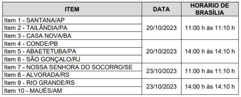 To carry out accreditation, send proposals, bids, negotiations and other stages of the process, bidders must access their personalized space, entitled “Bidder Area”, through the Caixa Bidding Portal, and select the “Access to the system” option. Accreditation must be done by 10am on October 17, 2023 and proposals must be submitted by 10:30am on the same date (always Brasília time). Bids for each unit follow the schedule below: