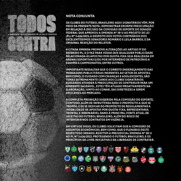 The football clubs of Brazil, undersigned here, through this note, express enormous concern regarding the decision of the Sports Commission of the Federal Senate that approved Amendment No. 38-U to Bill No. 3,626/2023, despite the opposing votes of the distinguished senators Romário and Leila Barros and the original rejection by the rapporteur.
