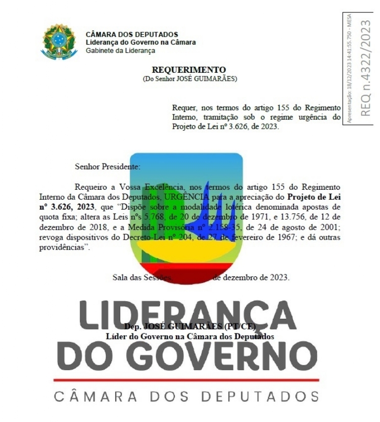The government leadership in the Chamber of Deputies presented Request 4322/2023 late this Monday (18) afternoon calling for urgency in the consideration of Bill 3626/2023, which regulates sports betting in Brazil.