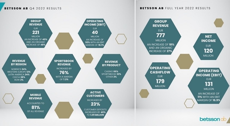 Turning the full year and while Betsson did not go into as much detail as it did with Q4, it did reveal that revenue increased 18% year-on-year to €777.2m.