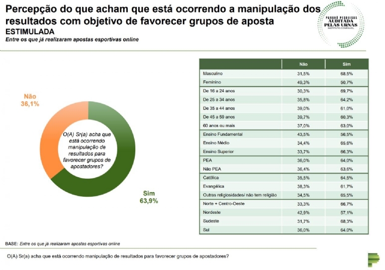 In addition, most respondents (63.9%) believe that there is manipulation of results to favor groups of bettors against bookmakers that operate in the Brazilian market. 36.1% do not think there is such a practice.