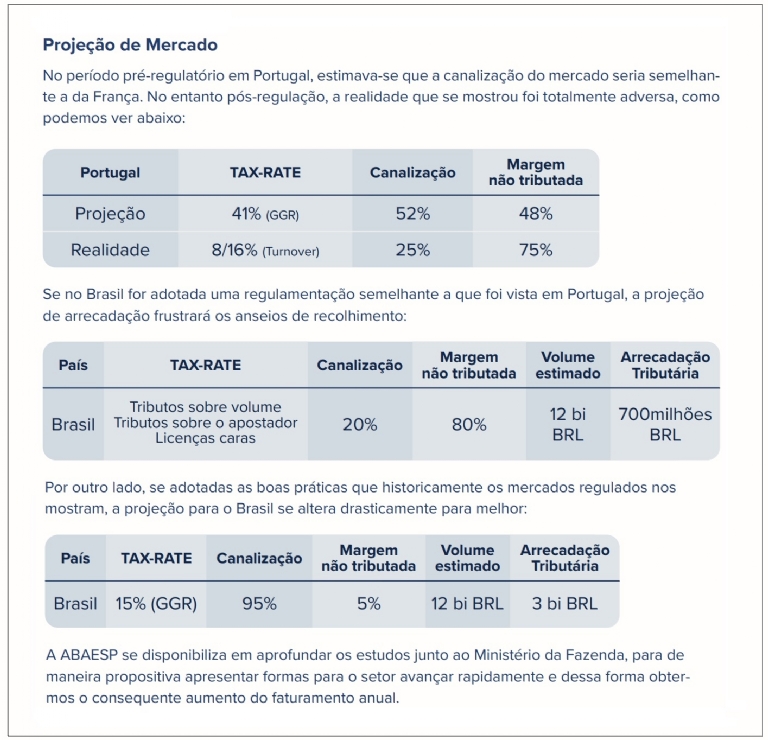 In the document, ABAESP describes margins that can be applied to the activity and return on tax collection, demonstrating that if Brazil adopts the good practices of well-regulated markets, it could reach, according to the studies, something around R$ 3 billion in taxes against no more than R$ 700 million if the license is very expensive and if both the bettor and the operator are taxed on the volume of bets, due to the migration to the illegal market.