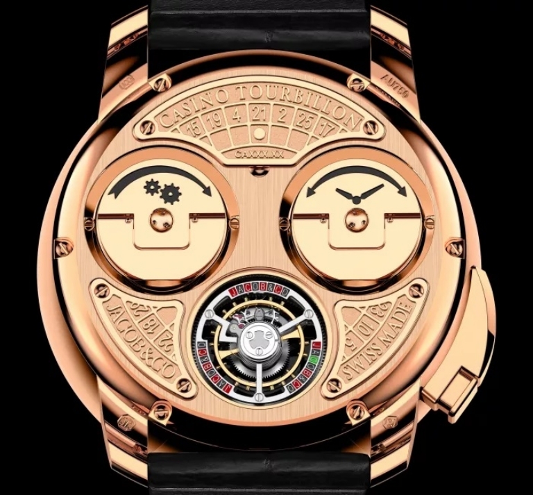 Crafted from 18k rose gold with a high-polished finish, the case of the new Jacob & Co. Casino Tourbillon measures 44mm in diameter by 16.3mm-thick. A heavily domed sapphire crystal with anti-reflective treatment protects the dial side of the watch; however, there is no winding crown protruding from the side of the case, with the only thing disrupting its round profile being the pusher located at 8 o’clock, which is used operate the roulette wheel game complication.