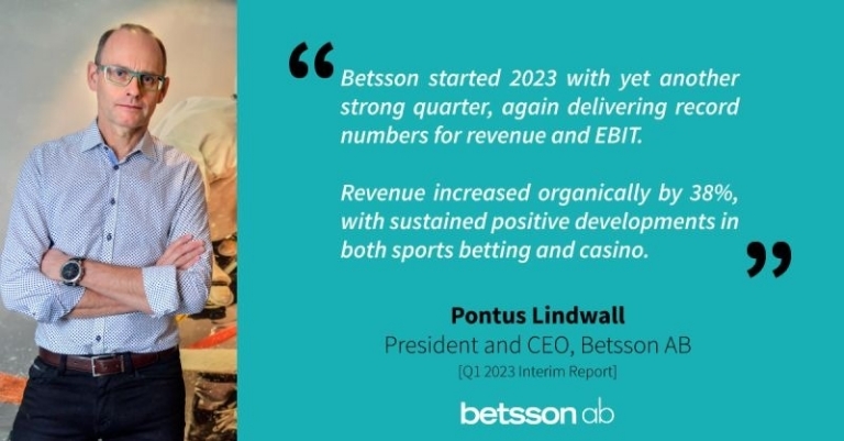 Betsson started 2023 with yet another strong quarter, again delivering record numbers for revenue and EBIT, even though the first quarter has historically often had less activity than other quarters. Revenue increased organically by 38 percent, with sustained positive developments in both sports betting and casino. Geographically, revenue increased in all regions except for the Nordics.