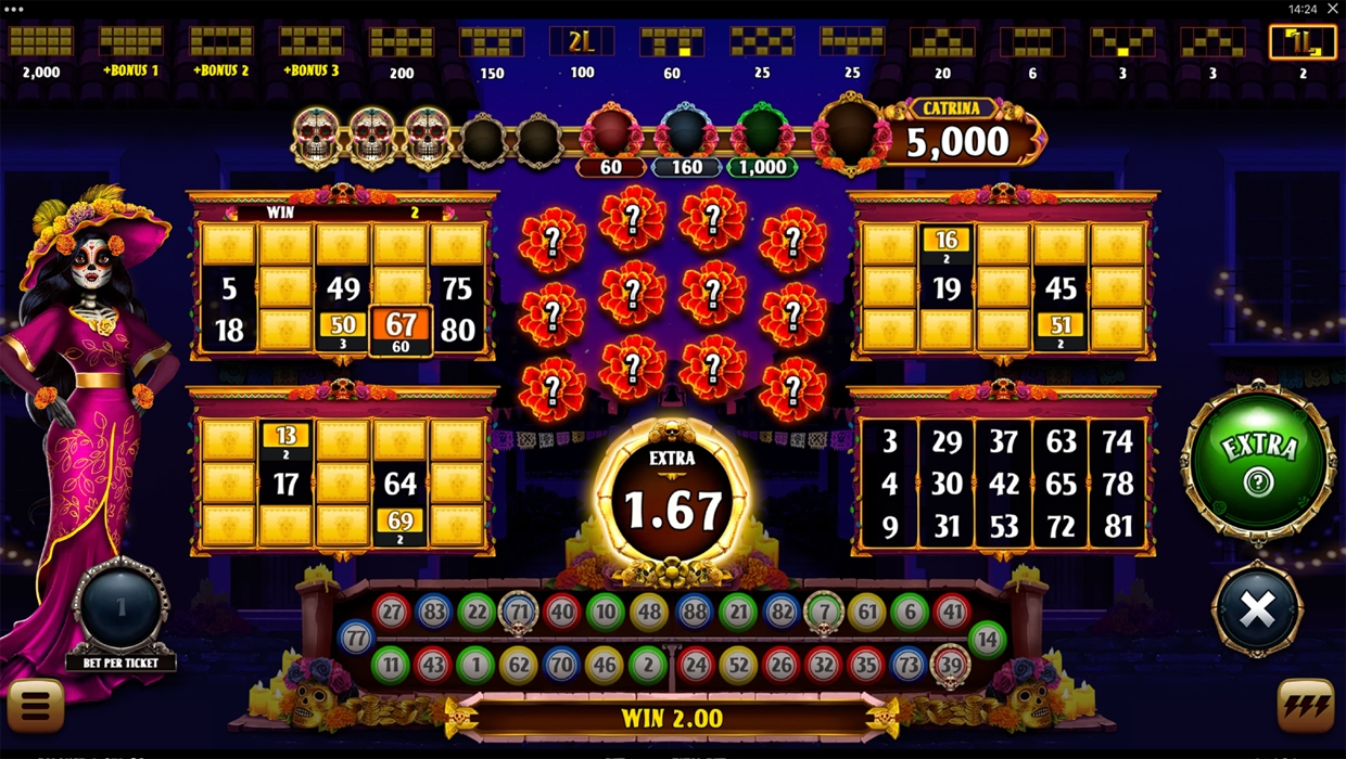 The new Catrina can be played with up to four cards, which enable players to seek the jackpot. Initially 30 balls are drawn and the user can get up to 12 extra balls to reach the dreamed accumulated prize.