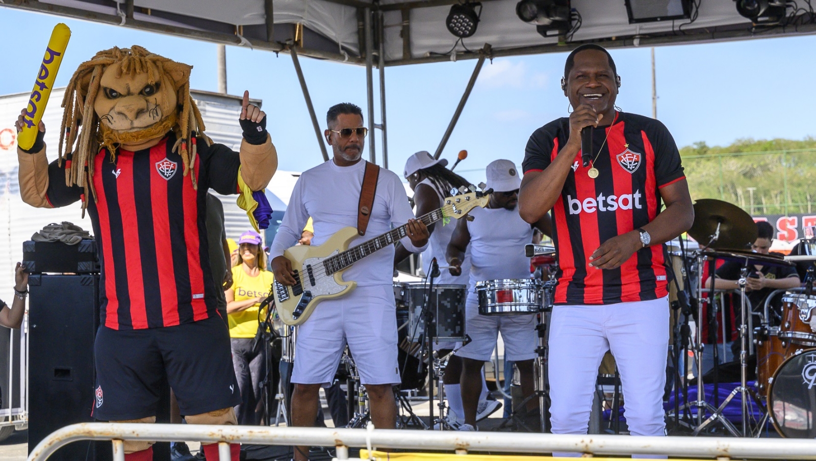 The experience began in the parking lot, where fans were greeted with a musical surprise: an exclusive performance by Tatau, the former lead singer of the band Araketu and a passionate Vitória supporter, wearing a customized team shirt.