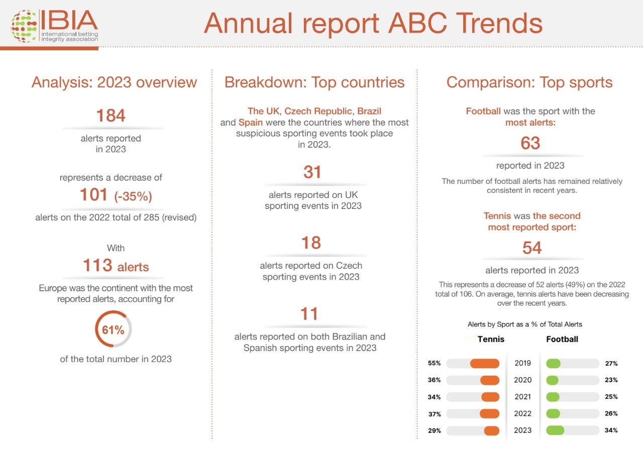 The report highlights that the total number of suspicious sports betting alerts reported in 2023 fell to 184, which represents a decrease of 101, or 35%, on the revised 2022 figure of 285 alerts. The global alerts for 2023 are significantly below the average of 244 annual alerts for the period 2019–2022.
