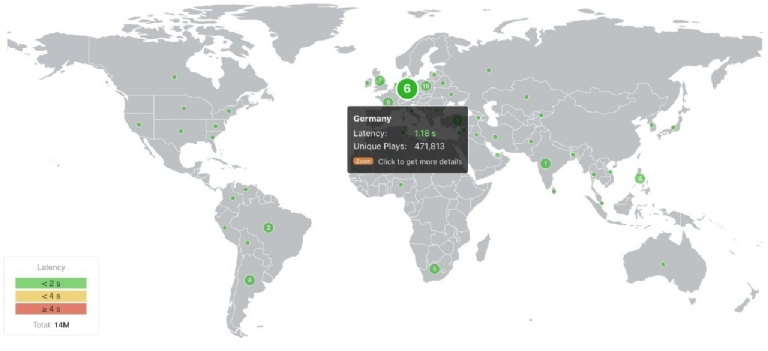 To maintain minimal latency, clients take advantage of nanocosmos’ world map displaying latency values per country. It is part of nanoStream Cloud Analytics. This tool helps monitor the backend of streams, ensuring latency remains minimal.