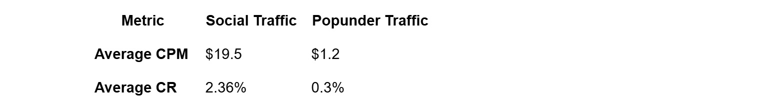 While Popunder traffic delivered a higher number of impressions, Social Traffic was more efficient at converting these impressions into sales, as reflected by its higher eCPM.