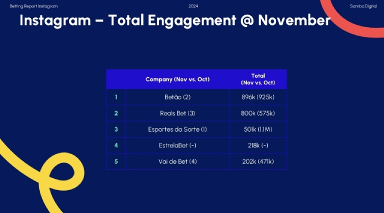 The profiles of companies operating in Brazil monitored monthly by Samba Digital, an agency specializing in sports marketing and iGaming, accumulated 3.9 million interactions in November and reached their lowest number in 2024, surpassing the mark of 5.3 million interactions in January.