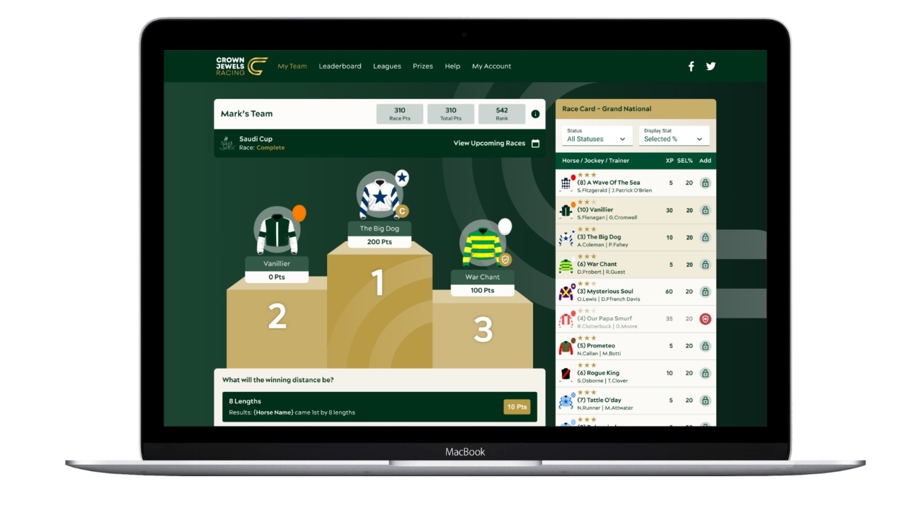 For each race, players must select three horses, designating who will finish first, second and third. Double points will be assigned to one horse chosen as captain, while players must also answer a tie-breaker question on the winning distances. Each horse is assigned an XP where the lower their score, the more likely the horse is to win the upcoming race. Horses with higher XP who win will deliver more points, encouraging players to select from the full field.