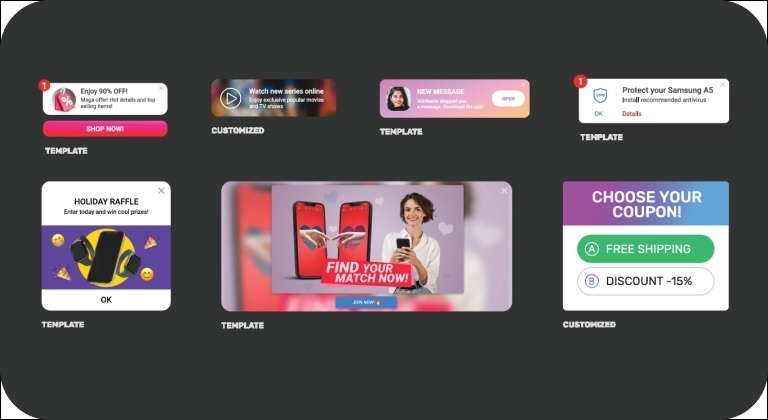 An exclusive ad format from Adsterra, the Social Bar encompasses a set of image ads, with more than 20 piece models, which can be changed to suit your offer.