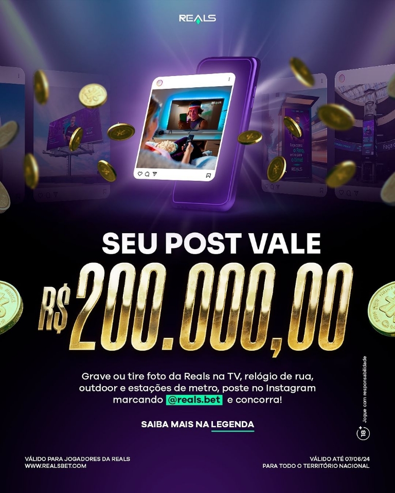To compete, bettors must be a follower of the company on Instagram (@reals.bet), leave their profile open for 24 hours after publishing the story and deposit R$10 (US$ 2) into their account on the platform. Anyone who has already deposited the amount before will also be able to participate in the promotion.