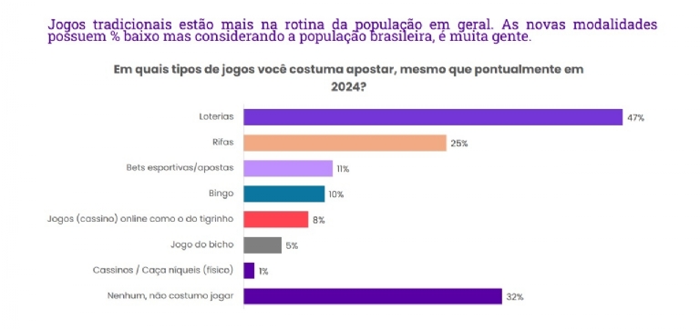 Conducted between August 7 and 9, 2024, with 2,839 Brazilians from all social classes, lotteries appear as the most popular choice among Brazilian gamblers, with 47% of respondents stating that they play this modality.