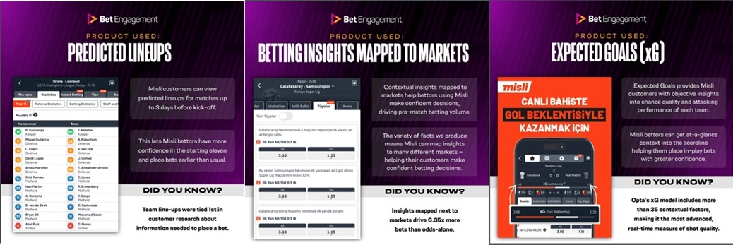 Misli in Turkey is a great example. They’ve integrated Opta’s features like predicted lineups, pre-game and live betting insights, in addition to Opta xG to make their sportsbook a one-stop shop to address every need their customers have. See what products they used below.