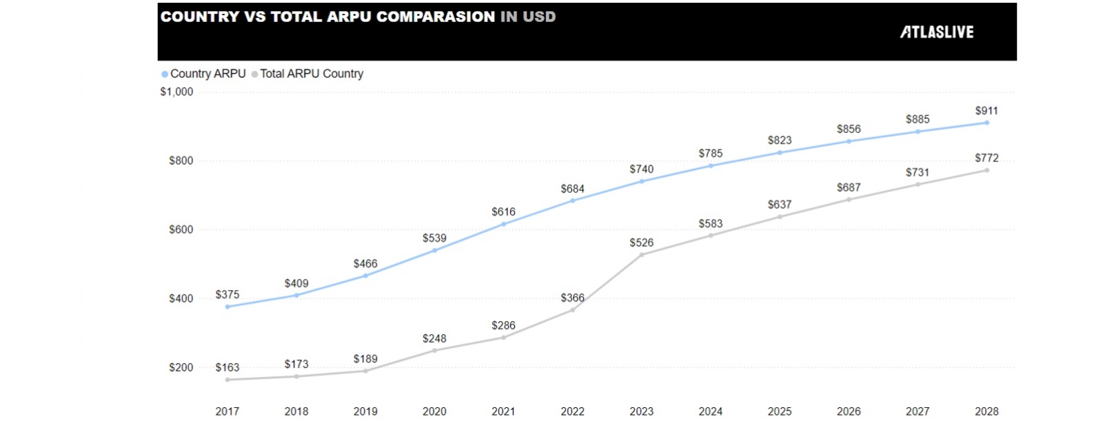 This upward trend continues through 2028, when Colombia’s ARPU is projected to reach $911, compared to the regional average of $772. Since 2020, Colombia’s ARPU has consistently outpaced the region, with the gap widening each year. This suggests better growth conditions or stronger demand for gaming services in Colombia than its neighbors.