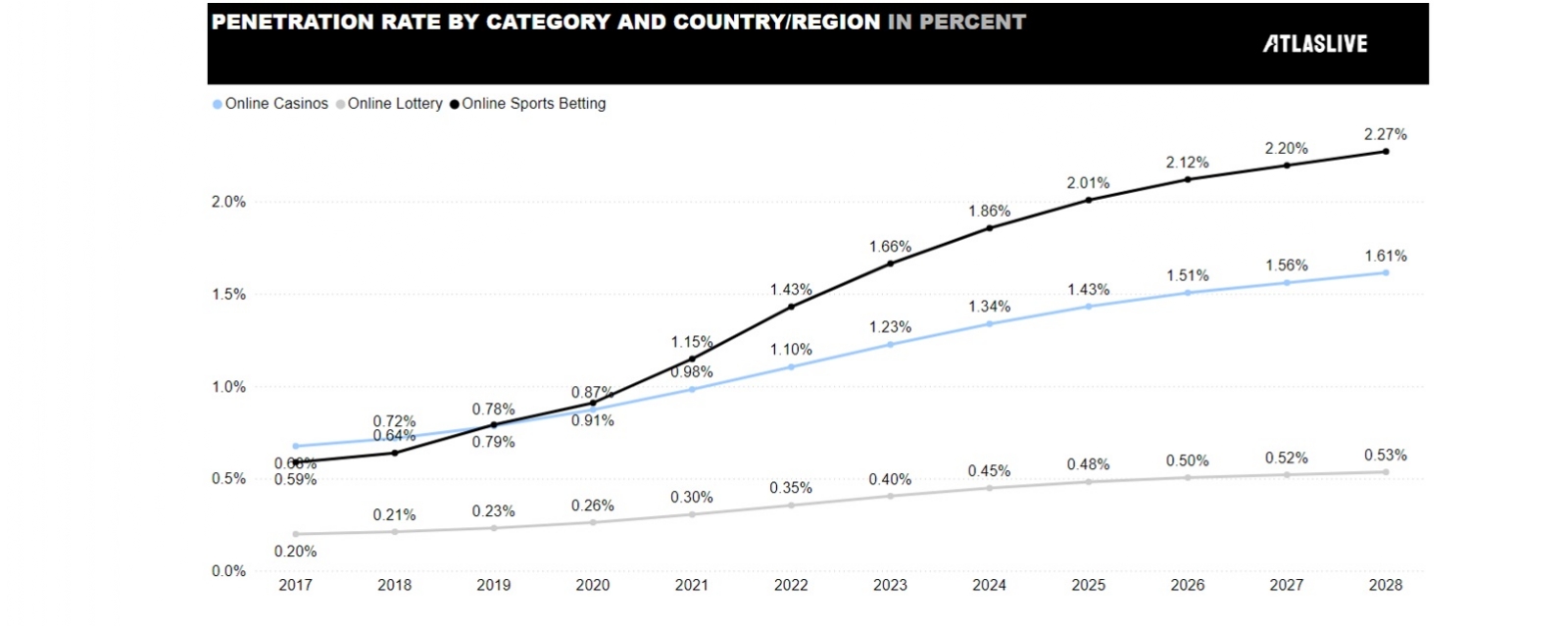 Online sports betting isn’t just growing — it’s dominating. Since 2017, it has shown the fastest growth among all categories, and by 2025, the average revenue per user (ARPU) for online sports betting is projected to triple that of other categories, surpassing $1,100. By 2028, it will continue to soar, strengthening its position as the favorite pastime for a growing audience. This surge speaks volumes about the enthusiasm and deep interest users have in sports betting.