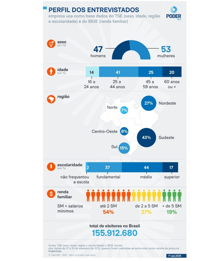 The PoderData survey was conducted from September 27 to 29, 2025. 2,500 people aged 16 or older were interviewed in 178 municipalities across the 27 states of the Brazilian Federation. Parametric weighting was applied to compensate for disproportionalities in the variables of gender, age, education level, region, and income. The margin of error is plus or minus 2 percentage points.