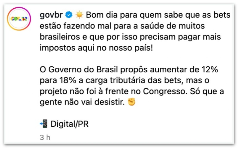 When sharing the video, the government stated that the proposal is “to raise the tax burden on bets from 12% to 18%, but the bill has not moved forward in Congress. But we’re not giving up,” the post added.