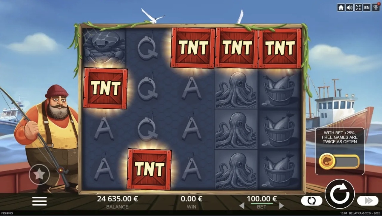 At times the skipper loses his patience to throw in a stick of dynamite to speed up the process, the resulting explosion will spray Credit symbols across the reels. If a Wild is there, the values will be instantly paid out to boost potential winnings. The Fish coin on its own will reel in multipliers between x10 to x100 in the base game. In Free Games, the Fish coin starts with a lower multiple and increases as it moves down the reel to build anticipation.