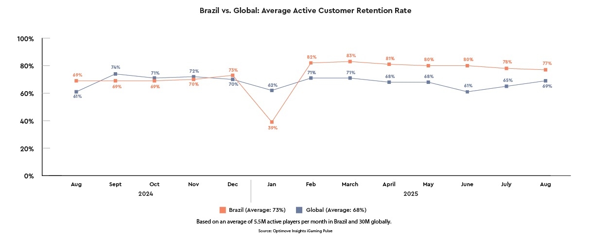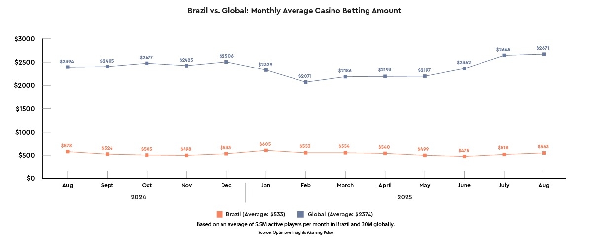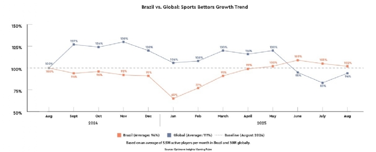 - Source: Betting trends in Brazil compared to the global benchmark in the trailing 12 months (August 2024-2025).