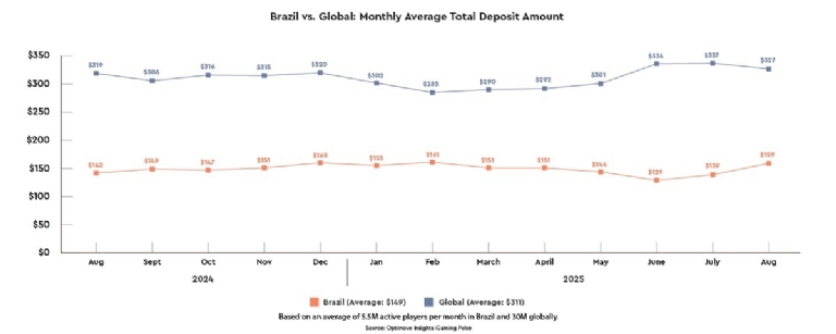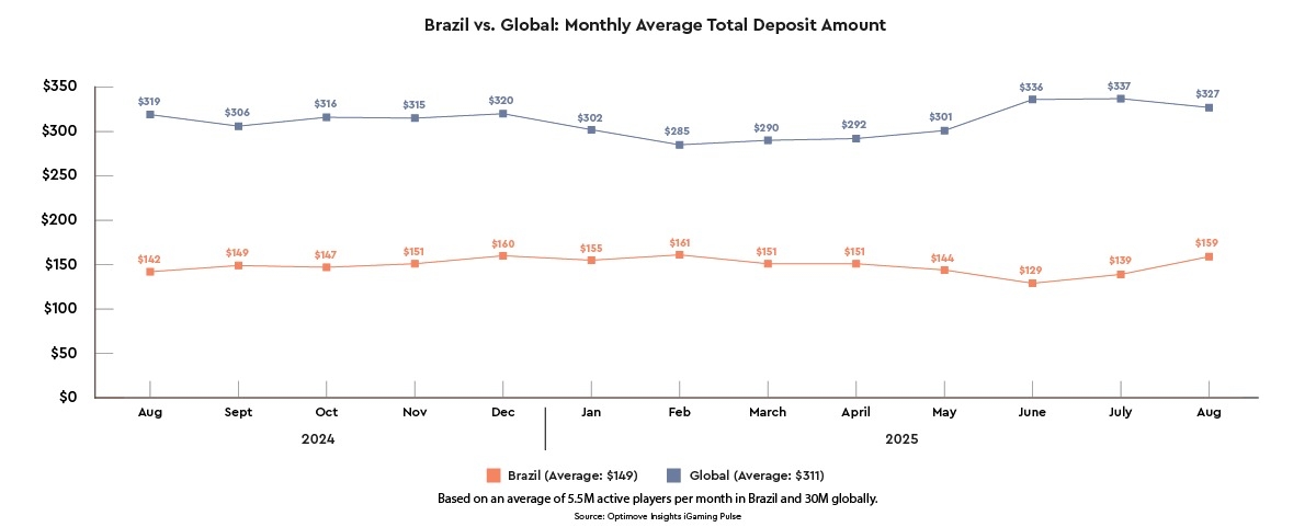 * Brazilian players deposit less but show upward trend: Brazil's average deposit in August 2025 was $159, significantly lower than the global average of $327. This represents a 12% year-over-year (YoY) increase for Brazil (from $142 in August 2024), compared to a 3% increase globally (from $319).