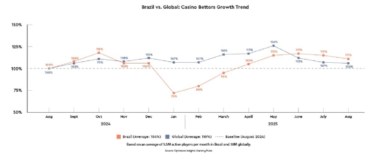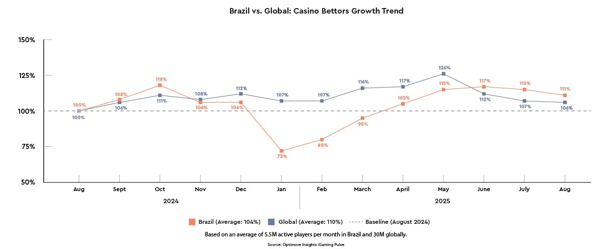 From June to August 2025, Brazil’s casino bettor base grew faster than the global trend, reaching 111% of its August 2024 baseline in August 2025, compared to 106% globally.