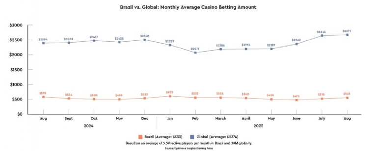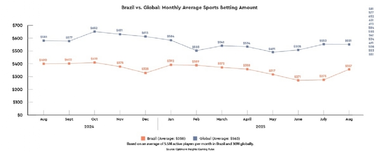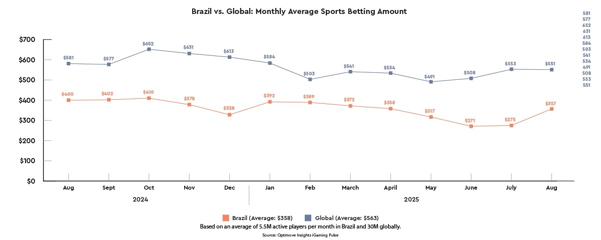 Throughout the year, global players consistently wagered more than Brazilian players. In August 2025, the average monthly sports betting amount globally was $551, compared to $357 in Brazil - a 54% gap, highlighting the continued disparity in spend per player.
