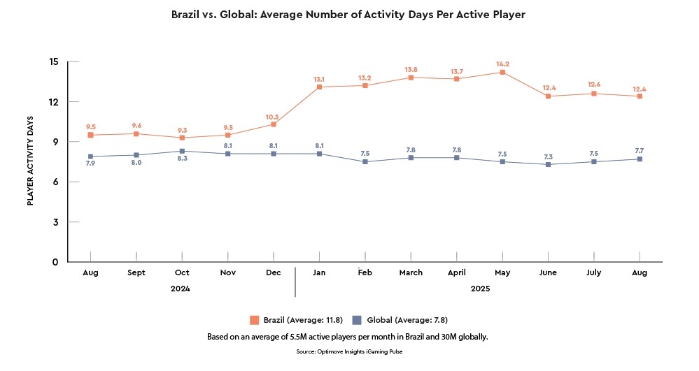 * Brazilian players are more engaged: Brazil continues to demonstrate significantly higher player engagement compared to global benchmarks. In August 2025, Brazilian users averaged 12.4 activity days per active customer, versus 7.7 days globally - a 1.6x gap. The average number of activity days in Brazil has remained stable since June, consistently hovering between 12.4 and 12.6 days.