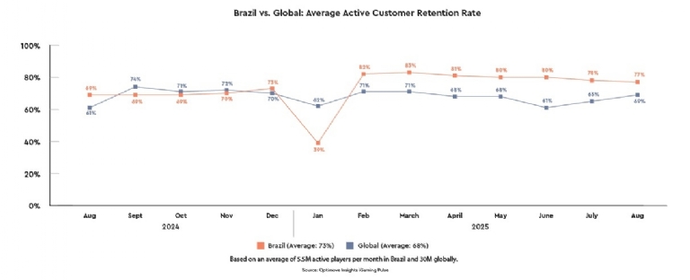 In August 2025, Brazil recorded a 77% retention rate, compared to 69% globally - a sustained 8 percentage point advantage. This trend has remained steady since February, with Brazil maintaining monthly retention rates between 77% and 83%, signaling a more loyal and resilient player base. In contrast, global retention fluctuated at lower levels, staying within the 61%–71% range.
