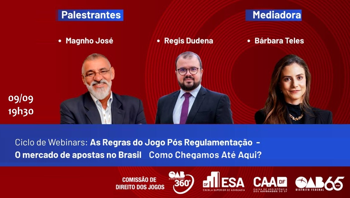 The webinar “How We Got Here” will be held on the 9th at 7:30 p.m., featuring a conversation between Regis Dudena, Secretary of Prizes and Betting at the Ministry of Finance, and Magnho José, President of Instituto Jogo Legal, moderated by Bárbara Teles, Vice President of the Gaming Law Commission of the Brazilian Bar Association, Federal District chapter (OAB/DF).