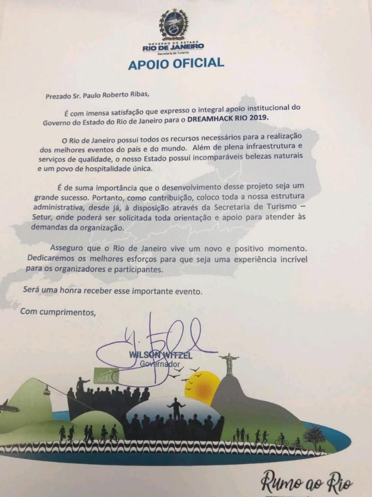 O documento endereçado a Paulo Roberto Ribas, organizador do Dreamhack Rio 2019, também coloca a disposição do evento toda a estrutura administrativa da Setur – Secretaria de Turismo do Rio de Janeiro para toda a orientação e apoio necessários para realização do evento.
