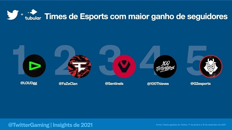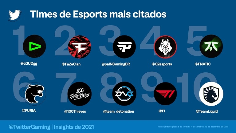 O país também se destacou entre os times mais citados, com a liderança de @LOUDgg e a presença de @paiNGamingBR e @FURIA na lista. A LOUD liderou o ranking de organizações que mais ganhou seguidores em 2021 no Twitter, batendo orgs como FaZe Clan, Sentinels, 100 Thieves e G2.