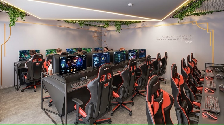 Logo ao lado da marcante estátua da personagem brasileira Raze, de Valorant, há uma sala reservada apenas para os funcionários jogarem – e com todos os equipamentos que fariam qualquer jogador sonhar com uma vaga ali. São quatro fileiras de computadores de última geração em uma sala totalmente ambientada para o eSports: muitas cadeiras gamers e RGB.