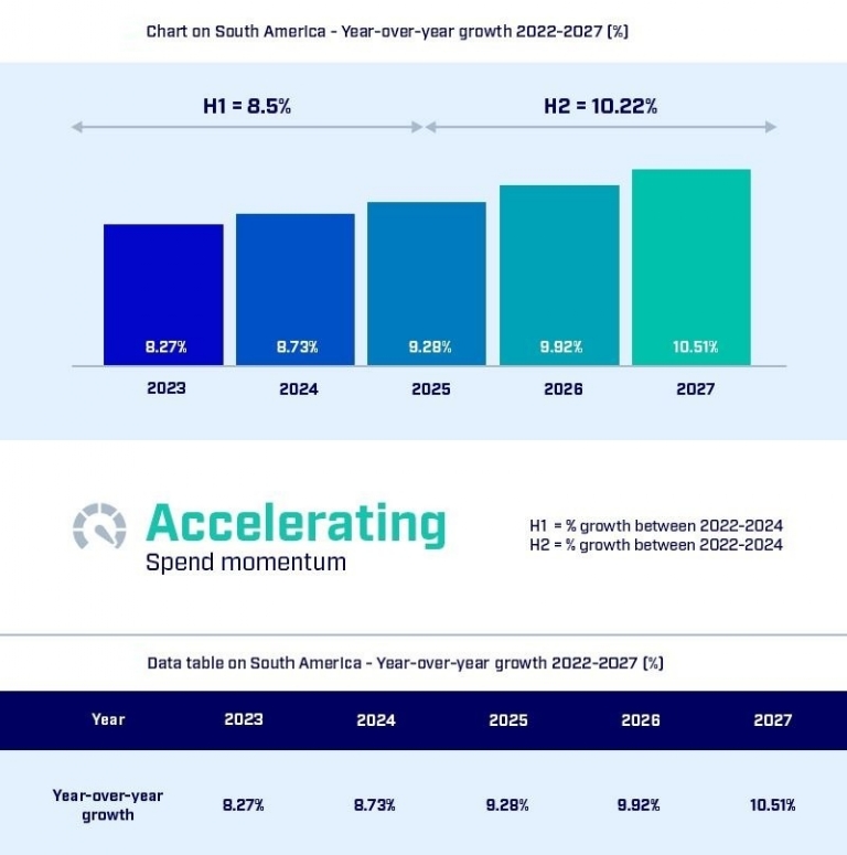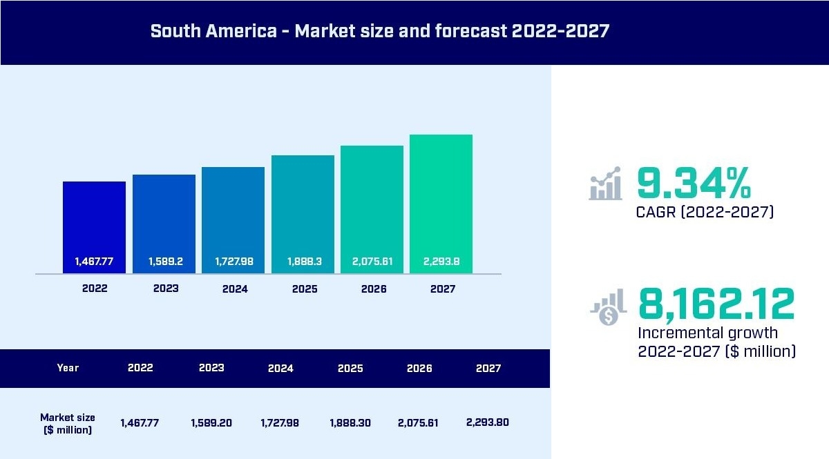 A expectativa é que a região tenha uma taxa de crescimento anual média de 9,34% entre 2022 e 2027, variando entre 8,27% e 10,51% de crescimento anual. Será a região de crescimento mais rápido no mercado geral e passará de US$ 1,4 bilhões em 2022 para US$ 2,2 bilhões em 2027, com um crescimento incremental de US$ 8,6 bilhões e contribuindo com 10,12% do crescimento incremental do mercado global entre 2022 e 2027.