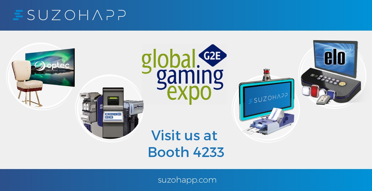 A Suzohapp oferece uma vasta seleção de componentes e na G2E está mostrando joysticks, fechaduras, alto-falantes, placas de vídeo, luzes LED e os novos carregadores USB de LED iluminados. O campeão de vendas, SH1950 Video Topper, agora está disponível em uma versão retroiluminada e será destacado, assim como as soluções de impressora TransAct.