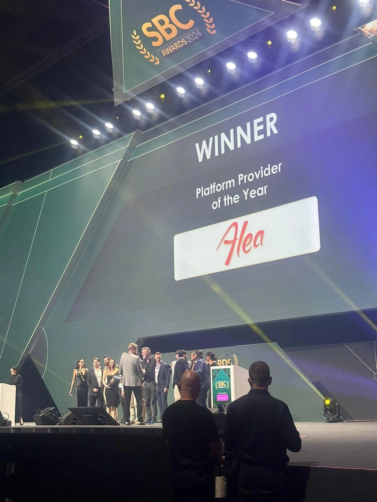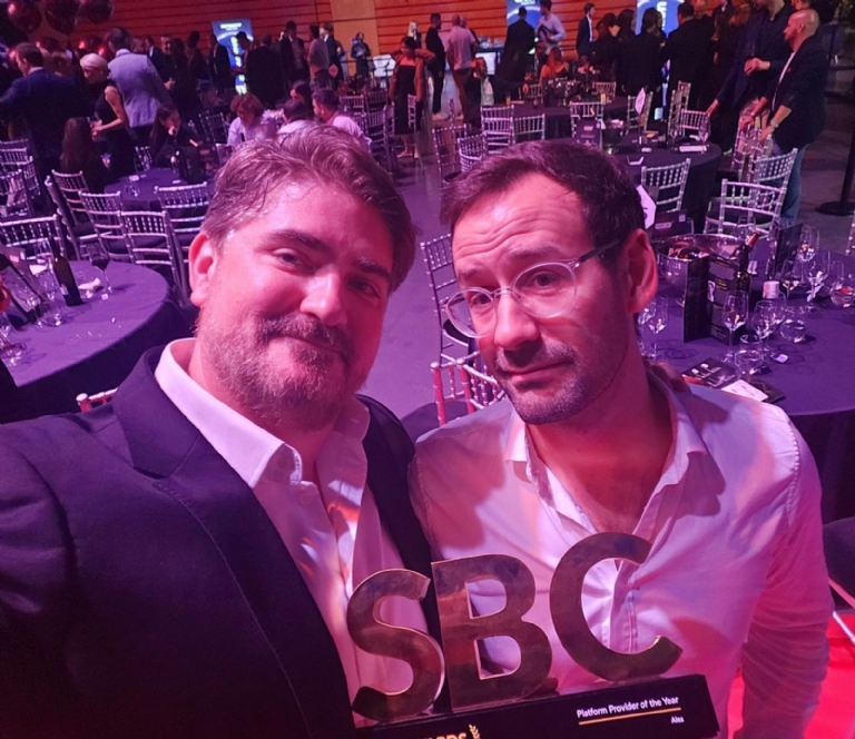 A equipe da Alea, acompanhada pelo fundador Alexandre Tomic, Jordi Sendra, CEO, e Lucas Lebleu, diretor sênior de negócios, foi premiada pelo SBC Awards na última noite do SBC Lisboa 2024 como Melhor Provedora de Plataforma.