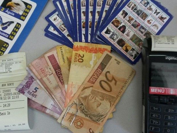 Foram encontrados com ele o aparelho semelhante à uma maquina de cartões de crédito e débito usado para entrar no sistema web, cartelas, dinheiro e até calendários da casa de jogos.