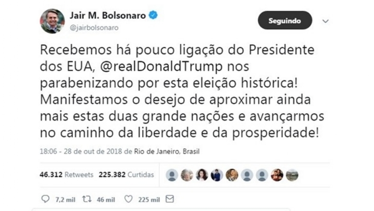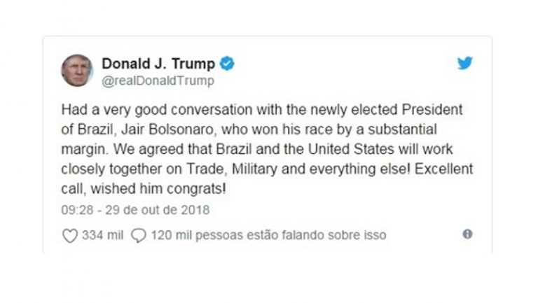 Durante sua campanha presidencial, Bolsonaro visitou os EUA e conversou com brasileiros que moram lá. Ele tem muito respeito pelos EUA, e um de seus objetivos é ter relações estreitas com aquele país. Esse também pode ser um lado positivo para a atração da legalização do jogo no Brasil, em especial com Cassino Resorts. Além disso, o presidente Donald Trump telefonou para Bolsonaro no dia em que foi eleito para parabenizá-lo e também twittou a respeito: