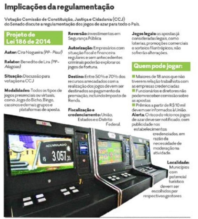 O texto do PLS 186/2014 contempla a regularização do jogo do bicho, videobingo e videojogo, jogo de bingo, jogos de cassinos em complexos integrados de lazer, jogos em apostas esportivas e não esportivas e jogos de cassino online. O credenciamento para exploração do jogo de bingo e videobingo terá prazo de 20 anos, renovável por igual período, e será de responsabilidade dos estados. Já o credenciamento dos cassinos terá validade por 30 anos, podendo ser renovado por sucessivos períodos.