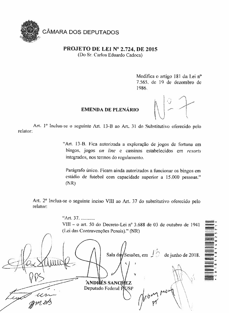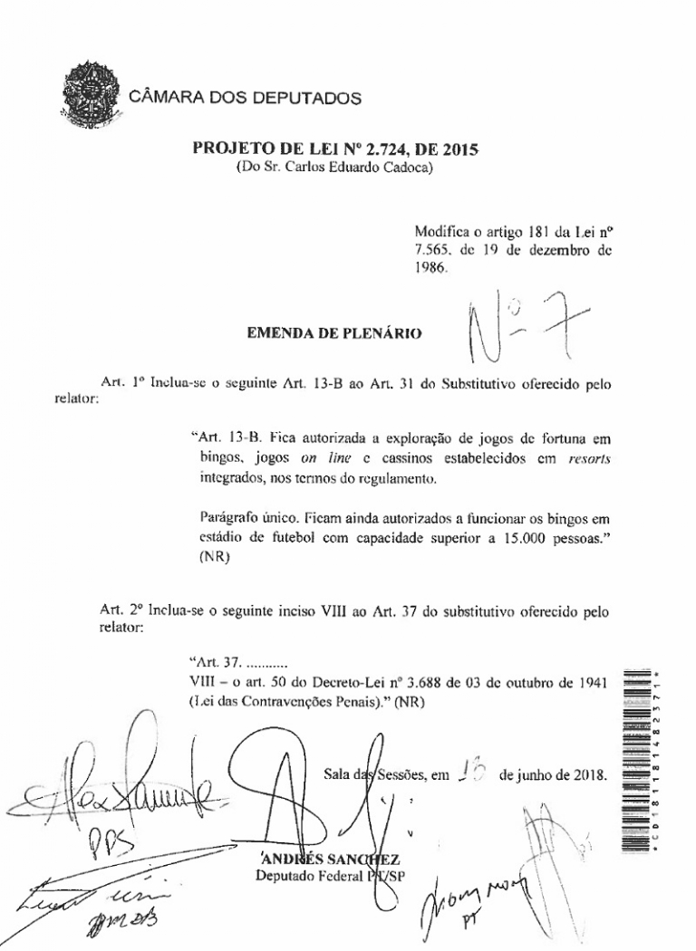 O Deputado Federal Andrés Sanchez (PT/SP) apresentou nesta quarta feira uma proposta de emenda para legalizar os jogos de fortuna dentro da nova lei geral do turismo. Segundo a emenda seriam permitidos jogos online, em cassinos com resorts integrados e até bingos em estádios de futebol.