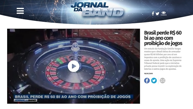 Em seguida, a matéria do Jornal da Band apresenta os dados da fundação Getulio Vargas mostrando que, apesar não regulamentado, o jogo já movimenta R$ 50 bi, em sua maior parte com loterias, e poderia chegar a R$ 180 bi com a liberação de cassinos e outras casas de apostas; dos quais R$ 60 bi serião revertidos ao Estado na forma de imposto.