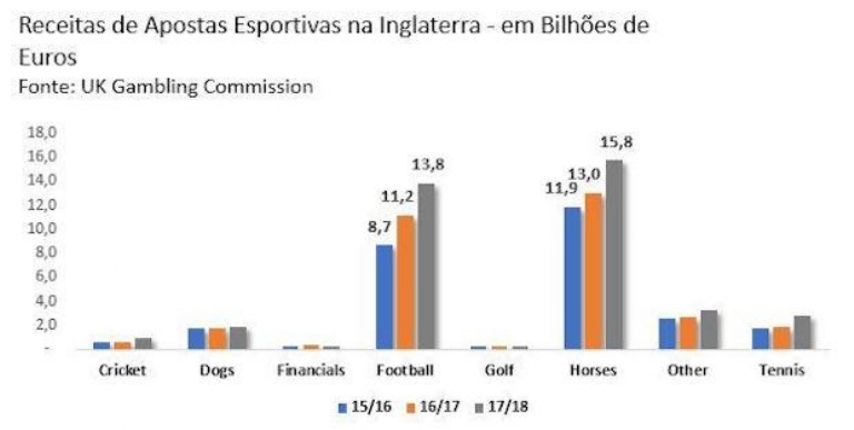 Os dados significam que as apostas em futebol, online e offline, representam 35% do total do segmento. Dessas receitas a parcela que fica com a casa de aposta (GGY – Gross Gambling Yield) é de € 3,0 bilhões (cerca de 9%), sendo que no futebol o valor é de € 1,7 bilhões (margem de 12%). Esta é uma indústria que além de gerar receitas, gera impostos e empregos. No Reino Unido as apostas esportivas deixaram cerca de € 1,5 bilhões aos cofres do estado, enquanto todo o setor gerava 106 mil empregos diretos.
