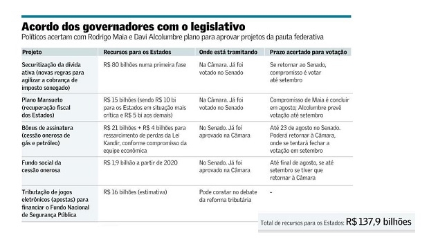 Os 27 governadores fecharam um acordo com os presidentes da Câmara, Rodrigo Maia (DEM-RJ), e do Senado, Davi Alcolumbre (DEM-AP), para que até o fim de setembro seja concluída a votação de pelo menos quatro propostas da "pauta federativa". O consenso é para aprovação, com urgência, de projetos que podem gerar receitas adicionais e imediatas aos Estados para dois fins, conforme acertado também com a equipe econômica: cobertura do déficit da Previdência e injeção de recursos para investimentos públicos.