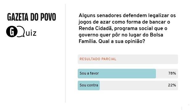 A enquete pregunta: “Você é a favor ou contra a legalizar os jogos de azar para bancar o Renda Cidadã?” e pode ser votada clicando aqui. A opção “Sou a favor” alcança 78% da preferência do público enquanto que a negativa soma apenas 22% após um dia inteiro de participação dos cidadãos.